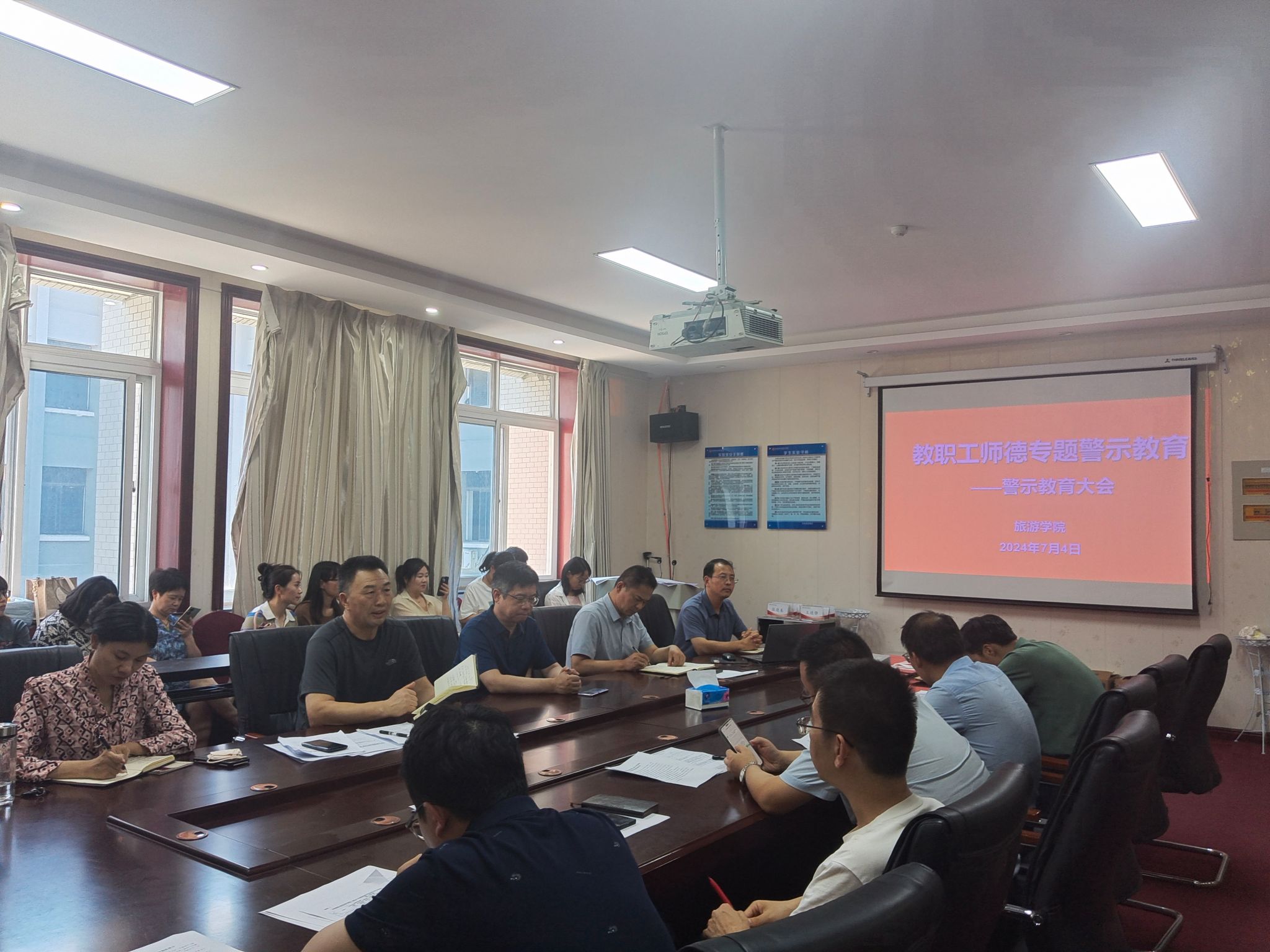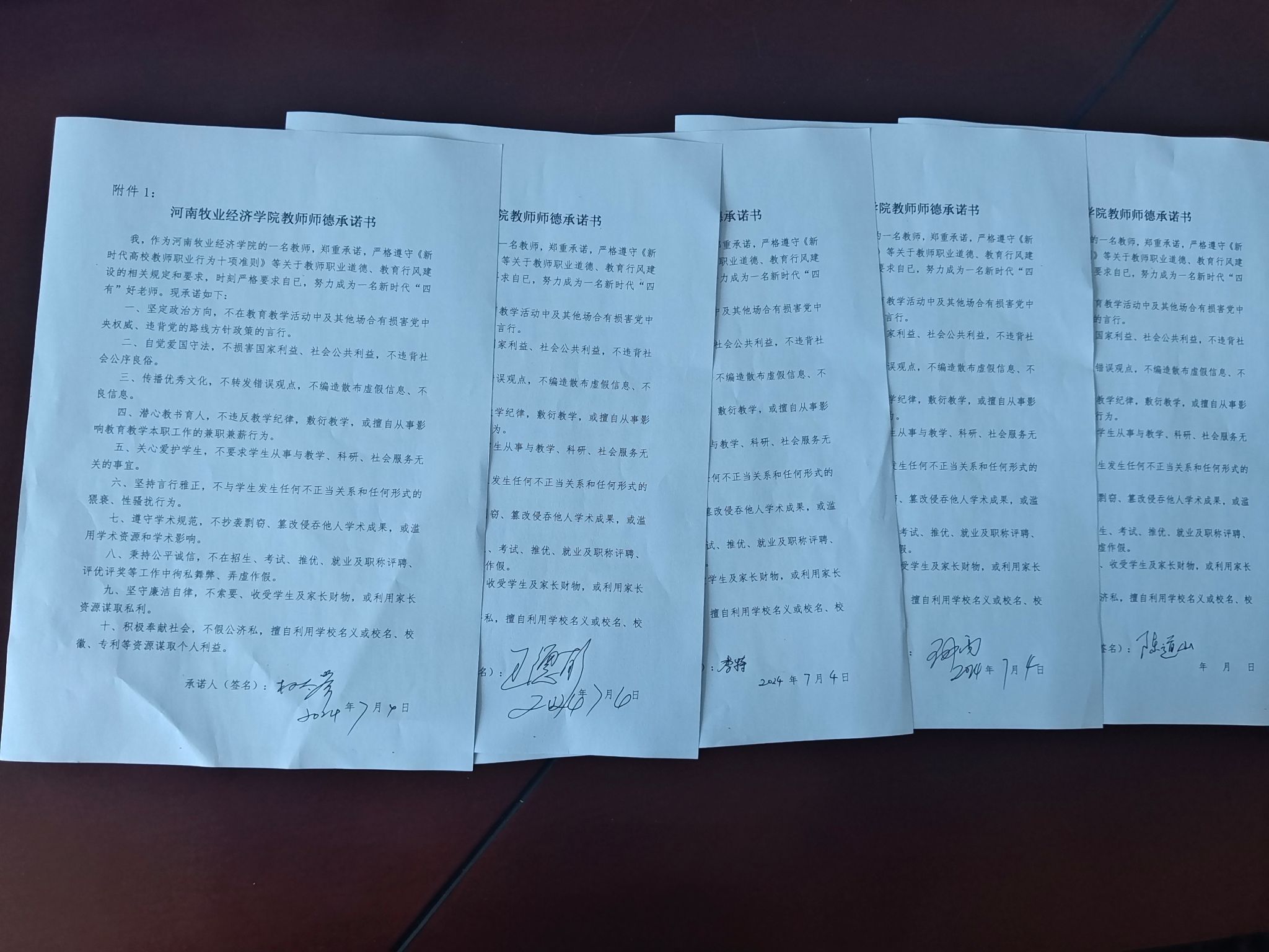 权太举传达了学校关于开展师德师风主题教育的总体部署,组织我院教师深入学习《河南牧业经济学院师德失范行为负面清单及处理办法》《新时代高校教师职业行为十项准则》《关于高校教师师德失范行为处理的指导意见》等文件。在随后的师德警示教育大会上权太举通报了两起违反教师职业行为十项准则典型案例,并组织全院教师签署了师德师风承诺书。