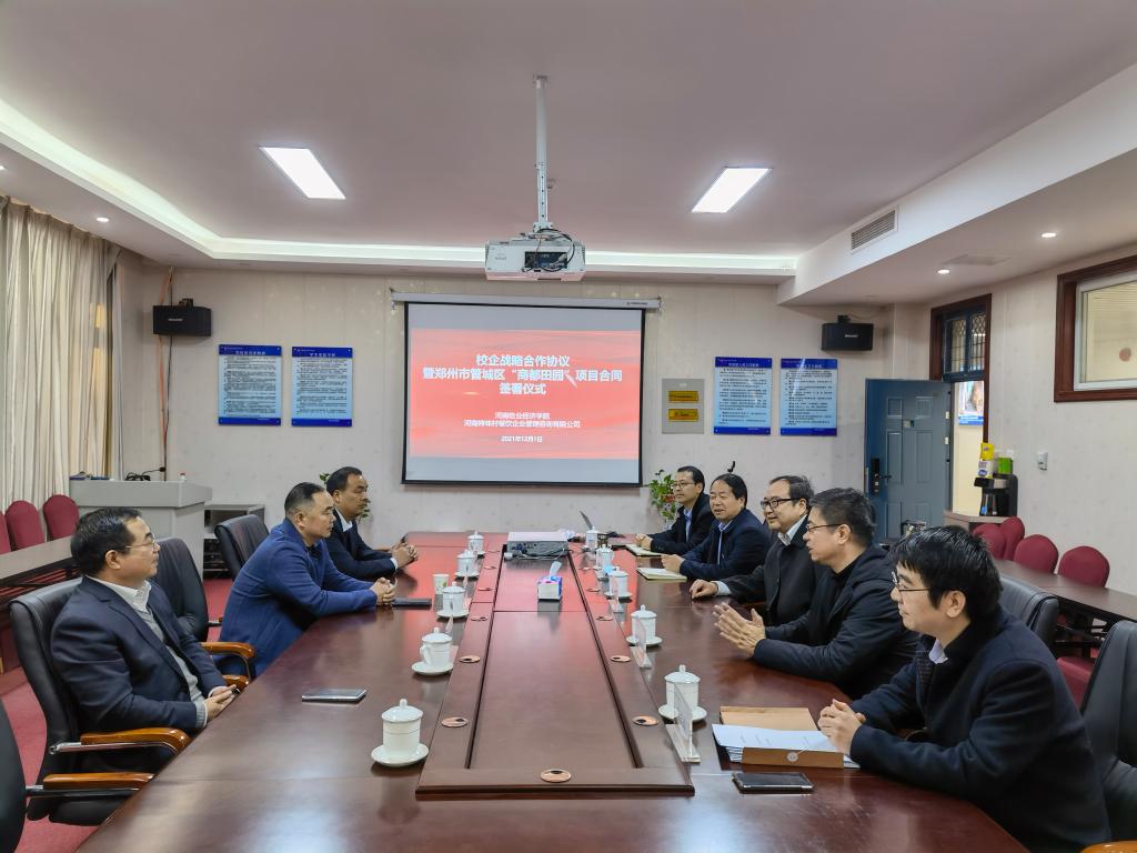 2021年12月1日上午,国产又黄又硬又粗i与河南特味村餐饮企业管理咨询有限公司校企战略合作协议暨郑州市管城区“商都田园”乡村旅游项目技术合同签约仪式在龙子湖校区尚严楼C426隆重举行。河南特味村餐饮企业管理咨询有限公司董事长韩跃军,河南牧业经济学院副校长张伟,国产又黄又硬又粗i党委书记李喜民、院长王德静、副院长王中雨及项目组成员参加了签约仪式。