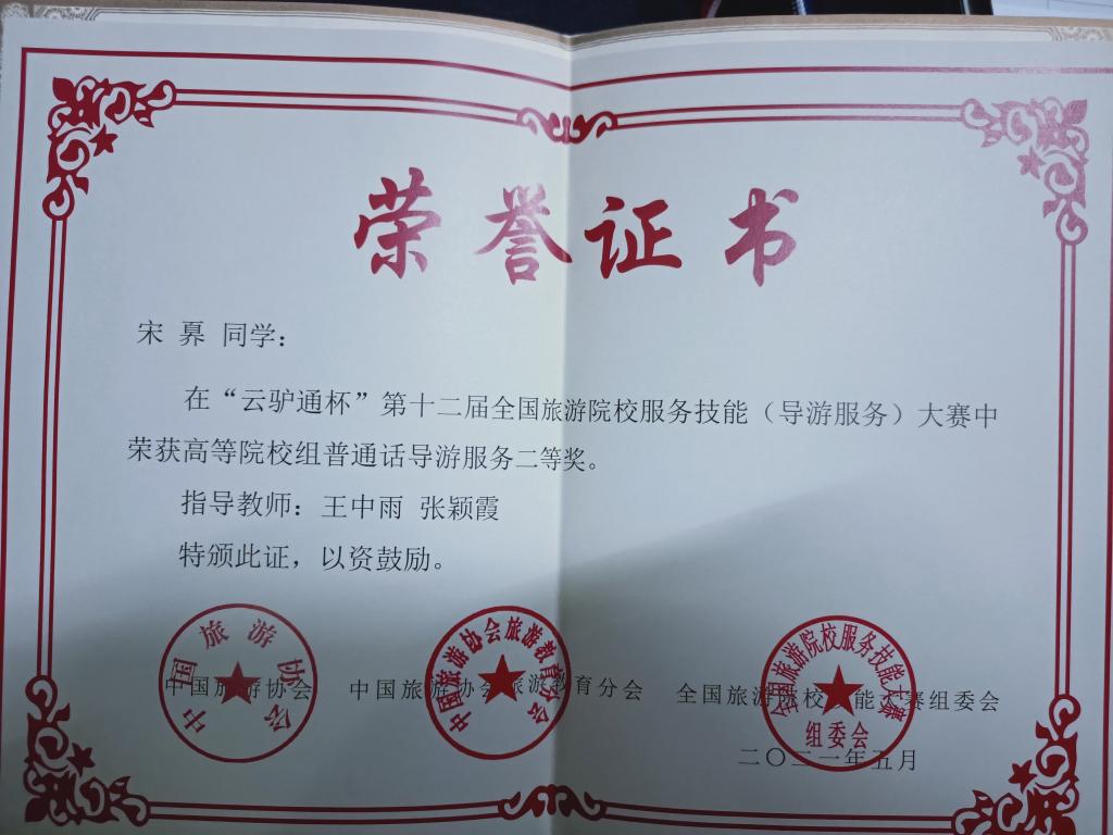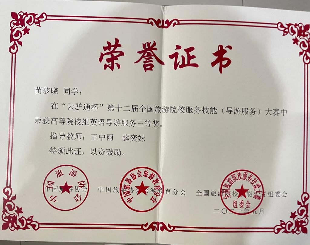 516日,云驴通杯第十二届全国旅游院校服务技能(导游服务)大赛在青岛酒店管理职业技术学校落下帷幕。我院派出3名参赛选手参加了高校普通话组和英语组的比赛。经过四天紧张而激烈的角逐,我院参赛选手成绩喜人,其中:宋奡获高校(普通话组)二等奖、刘梦云(普通话组)和苗梦晓(英语组)获三等奖的好成绩。