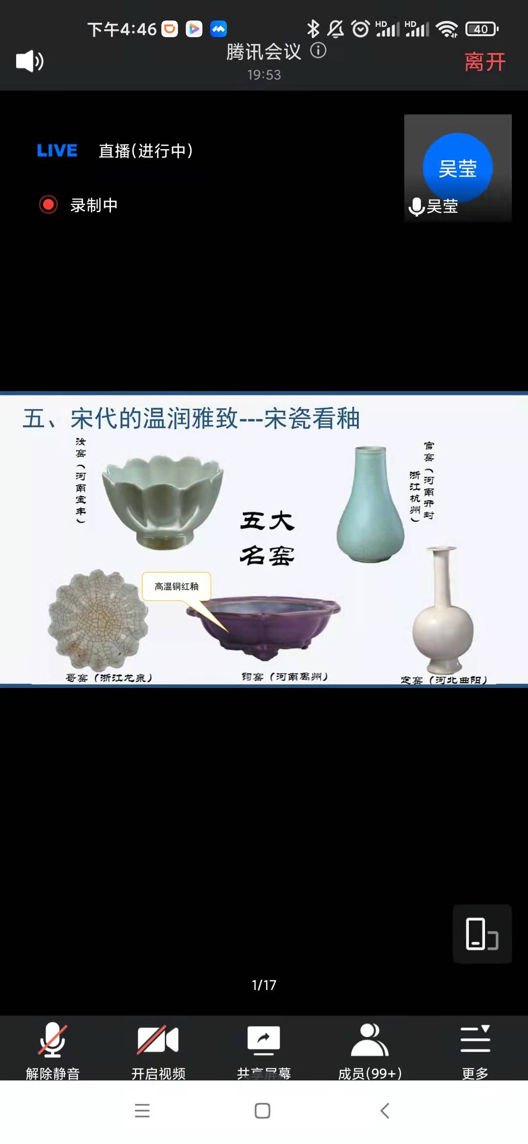 观摩课后学院举行了线上教学研讨活动,听课教师纷纷发言,大家一致认为吴莹老师能够将渊博的知识融入到一件瓷器、一场情景、一个事件中去,引人入胜,且融入课程思政内容,激发学生的爱国之情。良好的课堂效果和教学质量,离不开吴老师平时的读书积累与勤奋好学,与会老师均表示要加强学习,提高教学内容的理论深度和广度,并及时融入思政内容。同时,大家对教学过程中的师生互动、课堂节奏的把握等问题进行了深入探讨。
