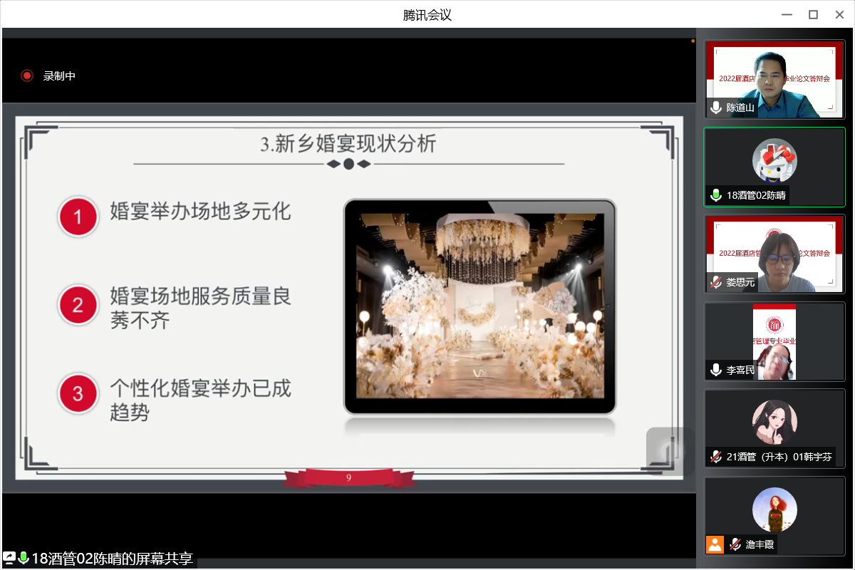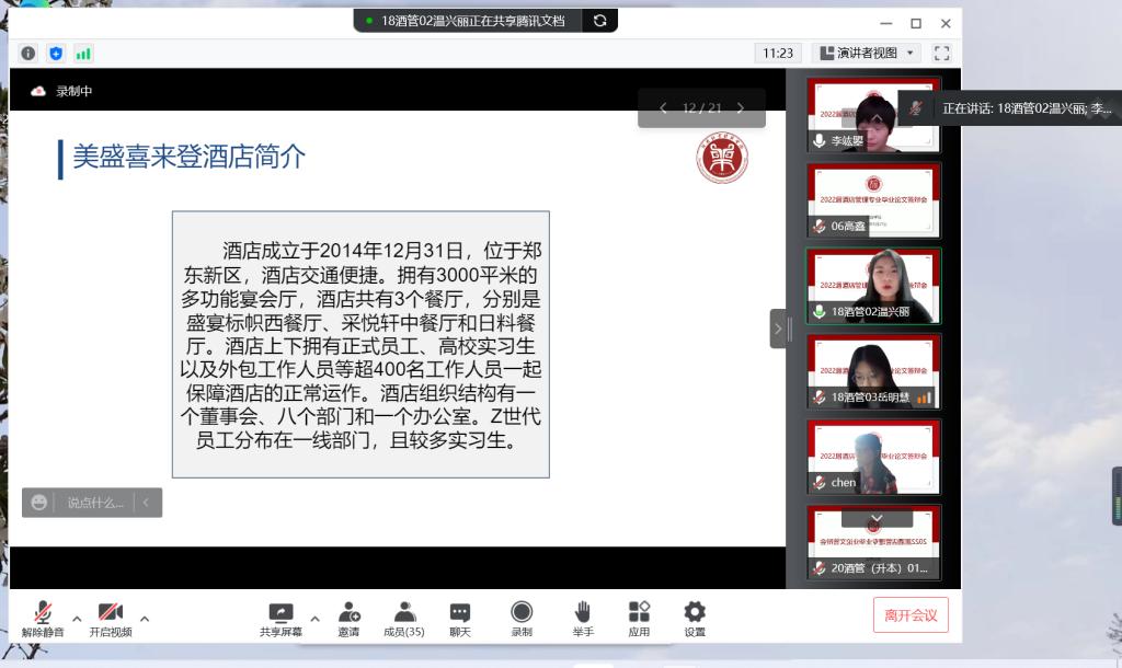 为切实保障本科教学质量,最大限度降低疫情对学生毕业的影响,5月21日,国产又黄又硬又粗i2022届酒店管理本科专业顺利完成187名毕业生毕业论文答辩工作。本次答辩师生全部通过腾讯会议采用线上方式进行,分为7个答辩组,院长王德静、副院长王中雨等42位教师参与全程答辩。