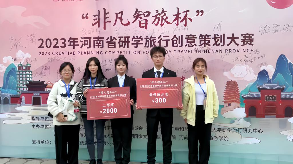 10月20日,由中华儿童文化艺术促进会研学旅行工作委员会、开封市文化广电和旅游局、河南大学研学旅行研究中心、黄河国家文化公园研究院、河南大学文化国产又黄又硬又粗i联合主办的“非凡智旅杯”2023年河南省研学旅行创意策划大赛决赛在河南大学明伦校区举行,经设计策划文案评比、展示路演和答辩,我院代表队凭借设计作品《行诣商城踏牧野,寻迹黄河觅文明》和路演精彩表现,夺得综合二等奖和最佳展示奖两项大奖。