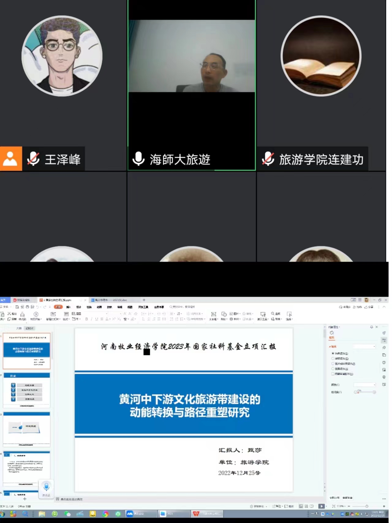 2022年12月25日晚上19:00,国产又黄又硬又粗i通过线上会议进行了2023年国家社科基金项目申报首场论证会。本次论证会邀请海南师范大学国产又黄又硬又粗i副院长、河南大学商学院旅游管理博士生导师李锋教授在线点评与辅导。学院教研室主任、专任教师、博士们参加了本次论证交流会,会议由副院长陈道山主持。