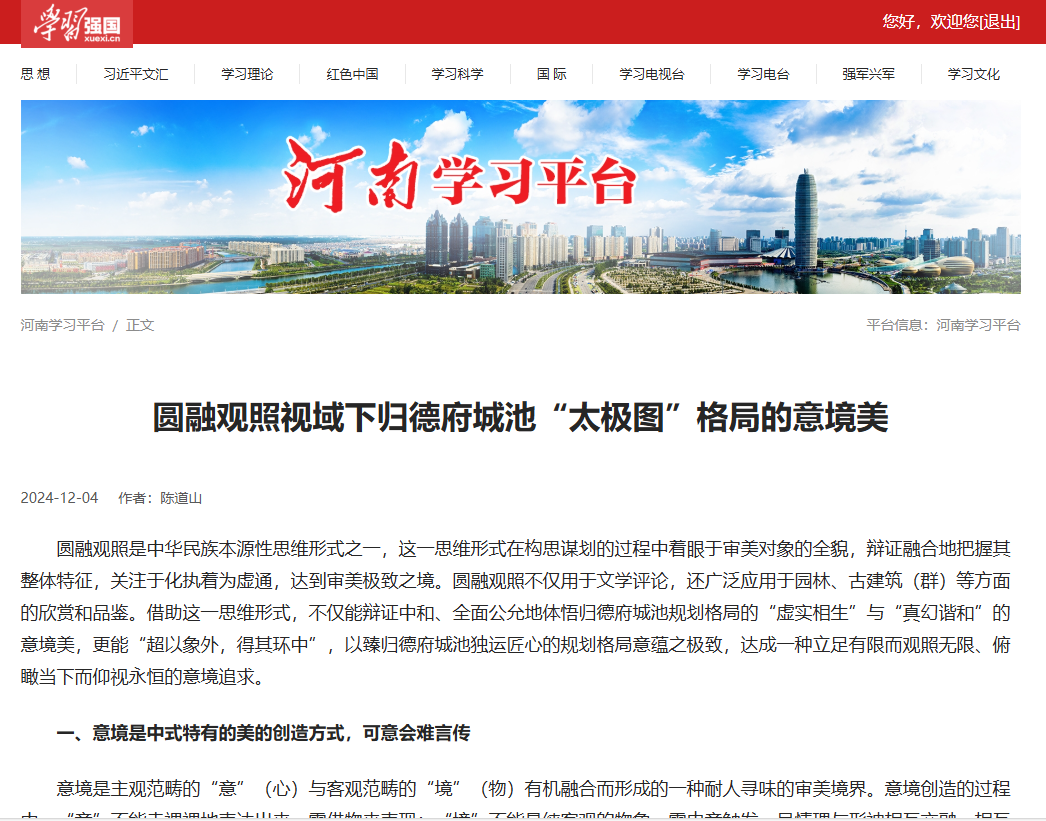 12月4日,“学习强国”河南学习平台发表了国产又黄又硬又粗i副院长陈道山的署名文章——《圆融观照视域下归德府城池“太极图”格局的意境美》。