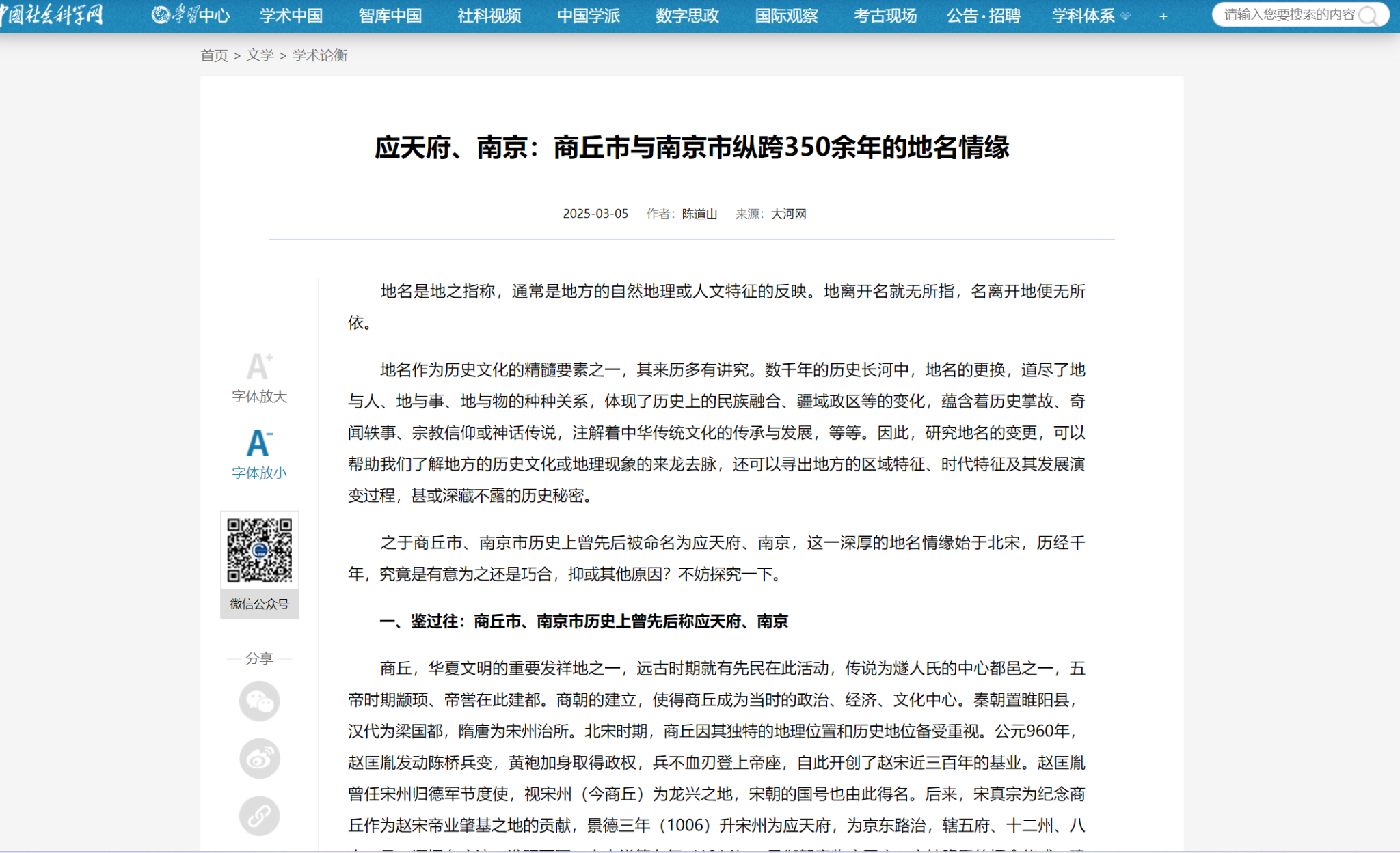 近日,我校国产又黄又硬又粗i副院长陈道山撰写的理论文章《应天府、南京:商丘市与南京市纵跨350余年的地名情缘》在《大河网·学术中原》首发后,引起了学术界的广泛关注。近日,该文章获中国社会科学网“学术论衡”栏目全文转载。