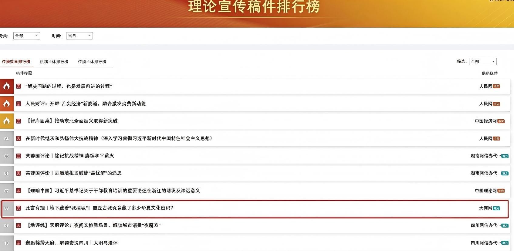 2025全省文化旅游发展大会召开期间,河南日报社·顶端新闻与大河网·学术中原重点发布了我院副院长陈道山潜心多年的研究成果——“商丘古城连续体”理论。这一创新成果引起了媒体的转载,从学习强国河南平台到新浪、搜狐、网易等主流媒体,再到腾讯新闻、大众网等新媒体平台。尤为值得一提的是,6月30日,更是登上中央网信办“理论宣传稿件排行榜”,位列第八。