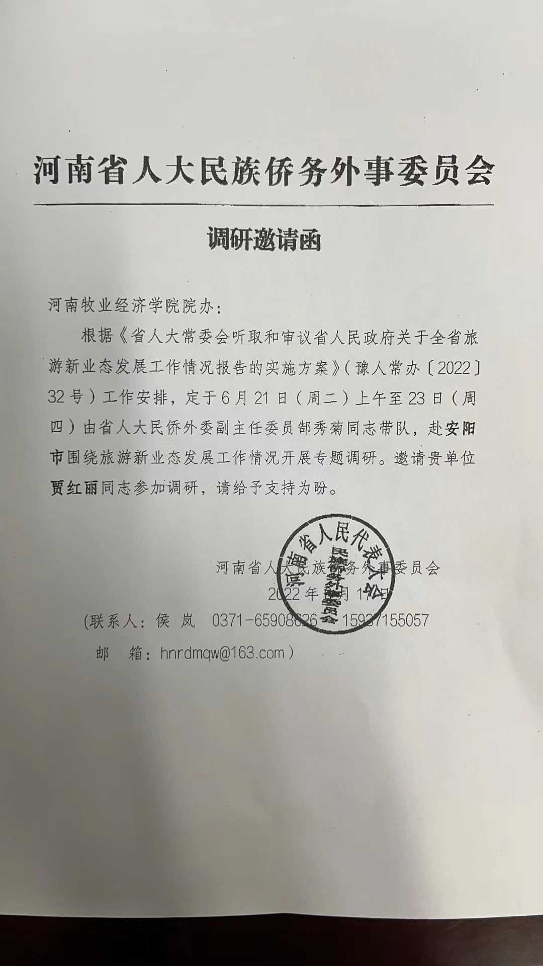 6月21日—23日,应河南省人大民族侨务外事委员会邀请,我院贾红丽老师随同省人大常委会调研组走进安阳就旅游新业态发展现状开展为期三天的调研调研组一行先后深入安阳县航空科普馆、林州市石板岩镇等地,实地察看民宿服务、乡村旅游等具有特色的旅游新业态发展工作情况。