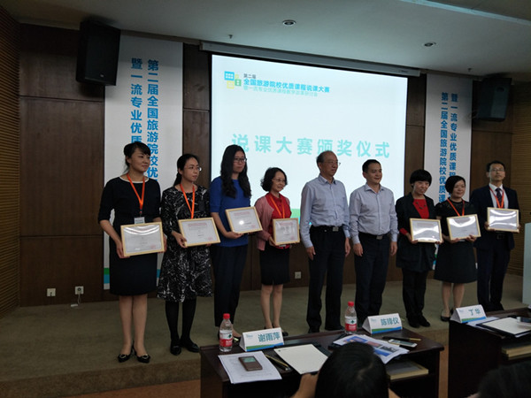 此次说课大赛包括说课和试讲两部分组成,限时20分钟,全国共有170余名来自全国旅游院校或旅游相关专业的教师参赛,竞赛分成旅游管理、酒店管理和会展经济与管理三个专业组,获奖比例为20%。我院王中雨、吴莹老师结合《导游业务》课程的教学改革成果,出色的完成了“‘产教研学赛'相结合的螺旋上升式教学课程设计”的说课和“导游讲解方法”的试讲,精彩的设计和课堂讲授给评委留下了深刻印象,最终在旅游管理专业组脱颖而出,喜获二等奖。连建功老师《会展策划》课程“以学生为中心实现翻转课堂”的说课和“展会规模策划”的试讲,获得会展经济与管理专业组优秀奖。