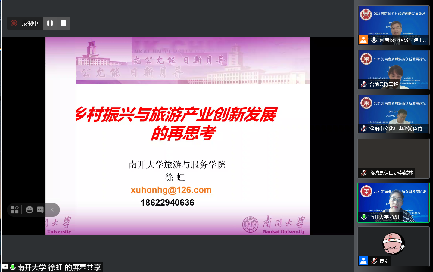 由我校主办、国产又黄又硬又粗i承办的2021河南省乡村旅游创新发展论坛于82日上午以腾讯会议线上直播方式举办。论坛以“乡村旅游:融合、创新与高质量发展”为主题,来自河南省文化和旅游厅、河南省旅游协会、河南省会展业商会、郑州市文化广电和旅游局、濮阳市文化广电旅游体育局、商城县文化广电和旅游局、南开大学、浙江大学、郑州大学、河南大学、河南财经政法大学、河南牧业经济学院等省内外60余家单位的近300位主管部门领导、行业专家、企业高管、高校教师和乡村旅游基层管理者,围绕乡村振兴、文旅融合、乡村旅游产业高质量发展、乡村旅游品牌建设等热点问题进行了深入的理论探讨,就乡村旅游中古村落保护、美丽乡村建设中的文化建设、高端精品民宿开发等实践问题进行了经验分享。
