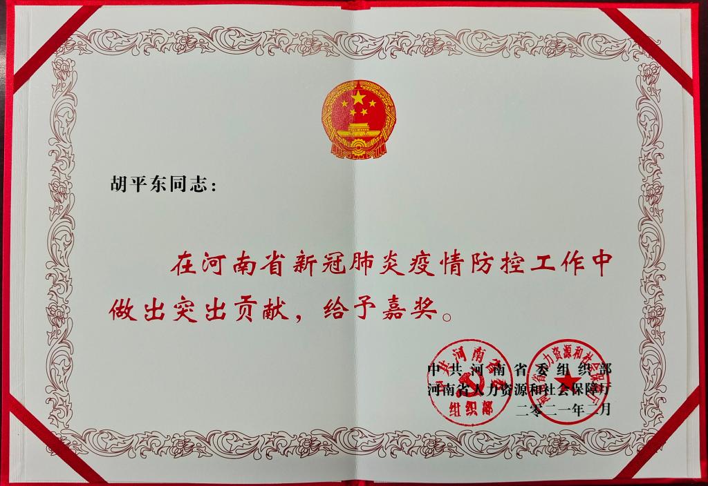 近日,中共河南省委组织部、河南省人力资源和社会保障厅对胡平东老师在河南省新冠肺炎疫情防控工作中作出的突出贡献发来嘉奖证书。胡老师表示,疫情防控是每一个公民分内的事情,作为党员更应勇于担当、敢于作为,冲锋在前做表率,新冠肺炎疫情防控阻击战的胜利是大家齐心合力的结果,自己的这点贡献不值得称道。