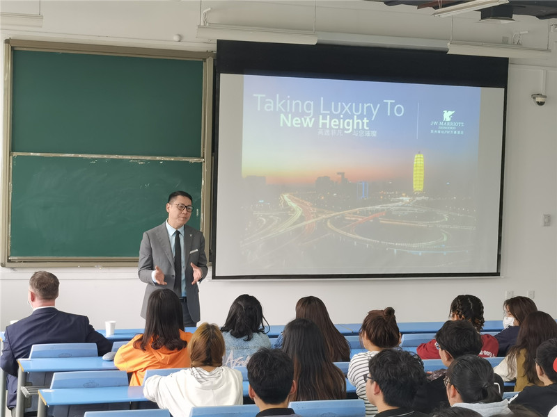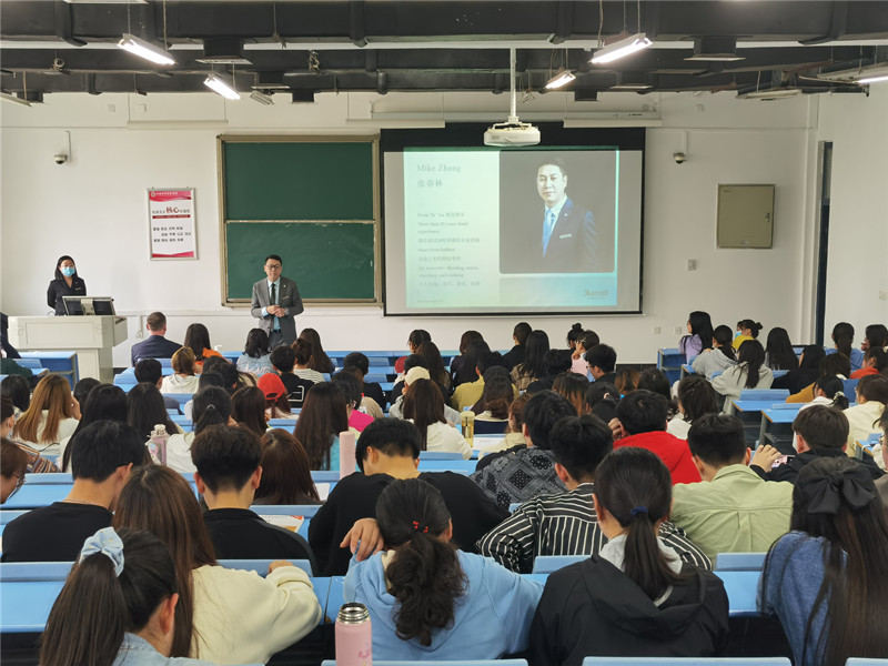 讲座伊始,张经理向同学们讲述了自己在酒店行业的职业发展之旅。从业之初,他在西安(阿房宫)凯悦酒店任职行李员,随后服务于洲际、希尔顿、喜达屋等国际酒店管理集团,先后奔波于北京、合肥、苏州、郑州等各大城市,拥有超过20年的酒店从业经验。张经理通过自己的丰富经历,向同学们分享了自己的座右铭:“Nothing is impossible”和“问题本身不是问题,问题是如何解决问题”,鼓励同学们在酒店任职的过程中把握机会,遇见困难的时候迎难而上,打败挫折,相信一切皆有可能。张经理为大家讲述了万豪酒店的前世今生,从民族品牌酒店的繁荣、国际标准五星品牌方兴盛世、奢侈品牌风起云涌三个方面向同学们展示了万豪酒店业的高速发展。随后,张经理从微观到宏观诠释了市场营销的内涵,通过日常生活中的例子让同学们更加了解营销与销售的区别,并讲解了酒店市场营销的策略。讲座最后,张经理对同学们提出几点期望:第一,期望同学们扩大知识面,提升专业技能;第二,希望同学们可以把自己的专业和社会需求结合起来,注重实际技能的培养。