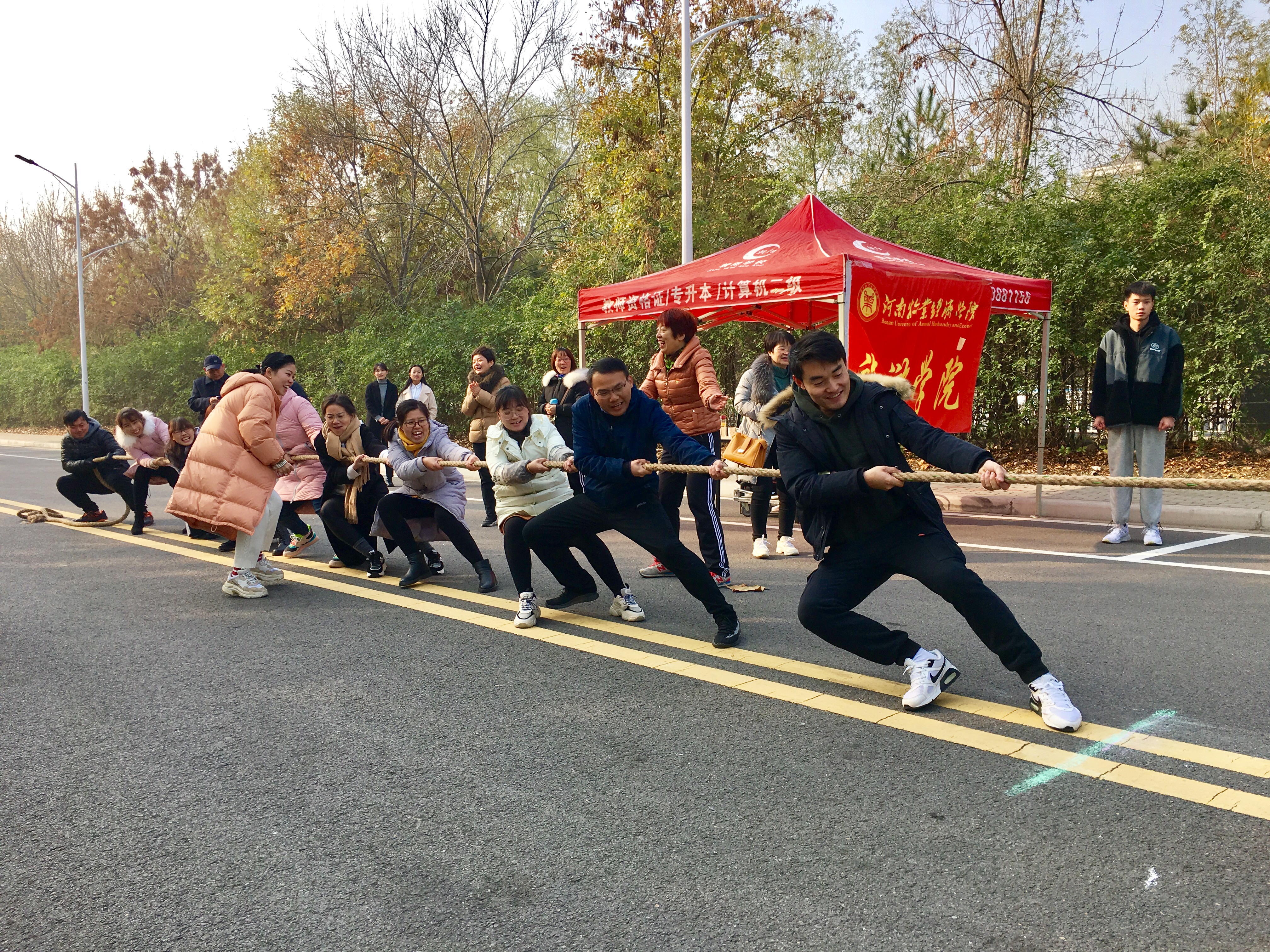 本次比赛以教研室为单位,四个教研室分为两组对阵。随着裁判一声令下,激烈的比赛开始了。只见参赛队员们紧抓大绳、神情庄重、鼓足力气,努力争夺。最终,酒店教研室与会展教研室分别在小组战中胜出。在决胜局中,两个教研室老师们拼尽全力展开争夺,凭借顽强的意志各赢一局,并列第一名。